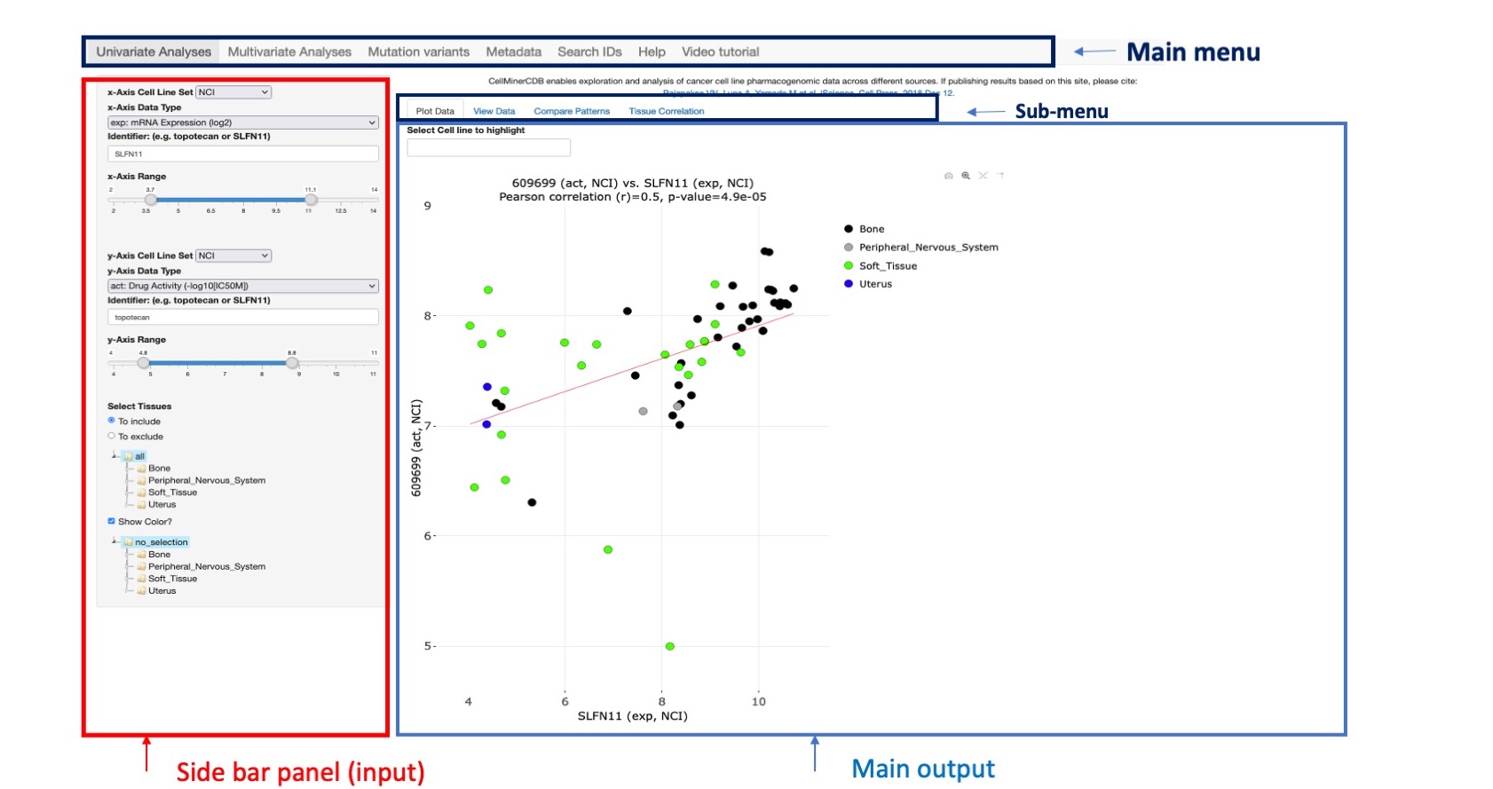 SarcomaCellMinerCDB is an interactive web application that simplifies access and exploration of Sarcoma cancer cell line pharmacogenomic data across different sources (see Metadata section for more details). Navigation in the application is done using main menu tabs (see figure below). It includes 6 tabs: Univariate Analyses, Multivariate Analysis, Mutation variants, Metadata, Search, Help and Video tutorial. Univariate Analyses is selected by default when entering the site. Each option includes a side bar menu (to choose input) and a user interface output to display results. Analysis options are available on the top for both the Univariant Analysis and Regression model tabs (see sub-menu on figure). The sub-menu first option result is displayed by default (Figure 1).