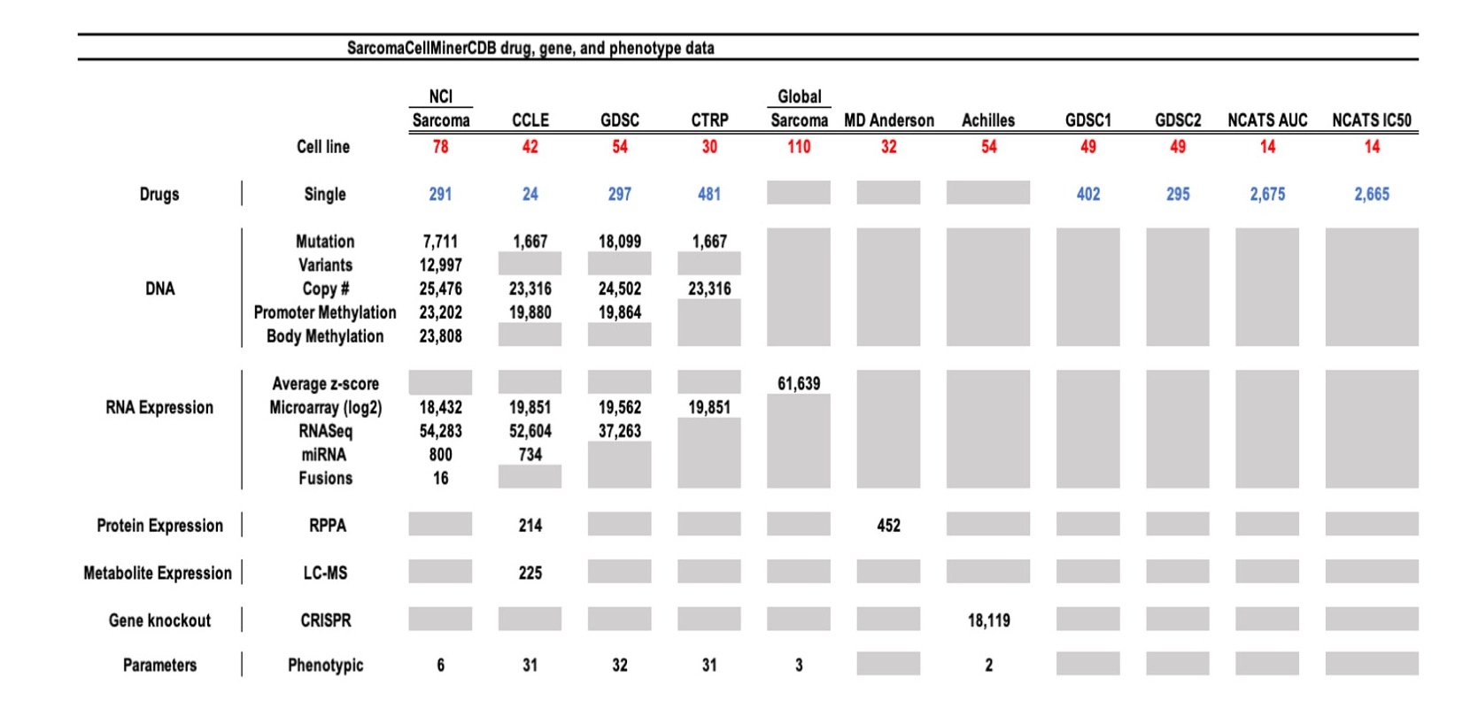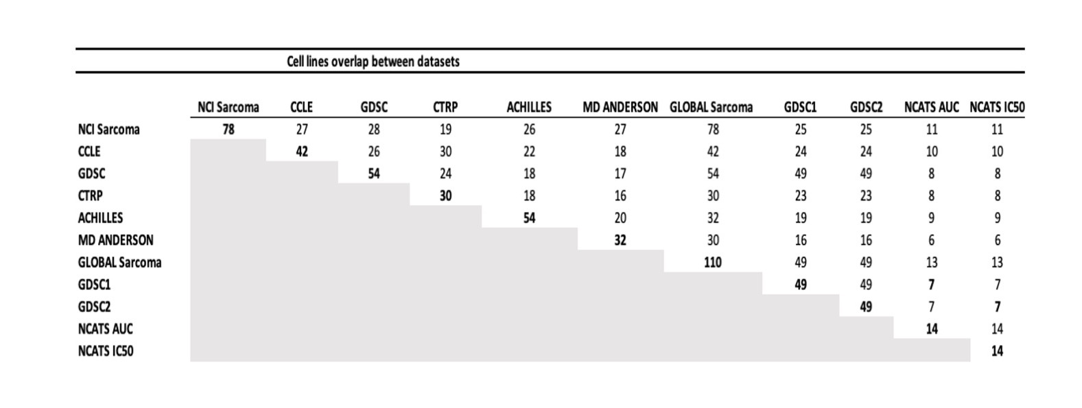 - CCLE, GDSC, CTRP, MD Anderson and Achilles Sarcoma specific datasets